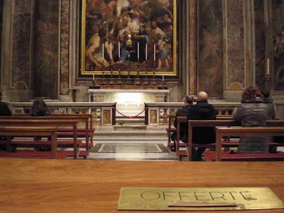 Com os atrasos todos e com as chegadas ao convento, davam as quatro horas na igreja de Santo Alessio; ainda me deu para ir aos sítios onde teimosamente queria ir antes de tudo: Videre Petrum. Lá me pus a pé (verifico agora que foram cerca de quatro km para cada lado) até são Pedro. Que a gente vá a Roma e não veja o Papa ainda é como o outro, pode até dar-se o caso de o Papa não estar lá, mas ir a São Pedro é um ato de união com toda a Igreja. Ver as luzes das janelas do Papa acesas, sinal que está a trabalhar, entrar na basílica de São Pedro e ver como tudo se desvela à medida que vamos andando, ver o túmulo de João Paulo II com pessoas em oração, ou o do grande João XXIII... tudo em grande, numa grande escala e de uma beleza incomparável.